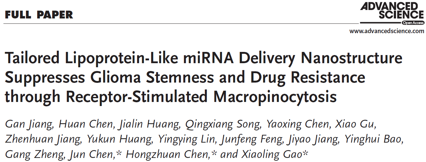 近日,我校陈红专教授团队在国际知名期刊Advanced Science(《尖端科学》)发表题为“Tailored Lipoprotein‐Like miRNA Delivery Nanostructure Suppresses Glioma Stemness and Drug Resistance through Receptor‐Stimulated Macropinocytosis”的文章,并入选该期刊封面论文之一。该研究综合运用肿瘤干细胞,仿生纳米和microRNA等手段探索神经胶质瘤的药理学调控和干预新策略。Advanced Science是Wiley旗下高质量开放获取期刊(影响因子15.8),刊载覆盖材料科学、物理、化学、医学、生命科学等交叉学科领域的基础和应用研究。