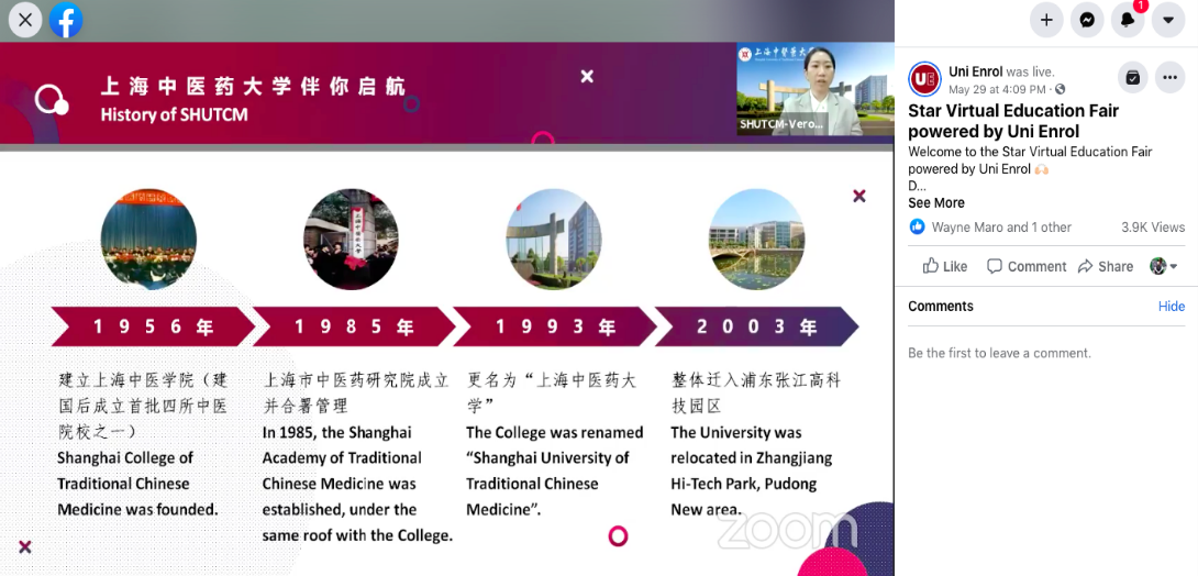 5月29日,我校国际教育学院招生与品牌管理推广中心项目主管朱芷薰、马来西亚籍学生李苑伈通过网络平台,向马来西亚高中生和家长作在线直播。朱芷薰介绍大学概况,学科专业,奖学金申请以及职业发展等内容。李苑伈通过自己的切身体会,分享了在上海中医药大学的生活和学习情况。直播期间,近150名马来西亚家长及学生观众在线,就专业申请流程、奖学金申请条件、课业压力,以及来华学习前的准备等方面问题踊跃提问。直播结束后,两位直播主持人还通过文字在线一一回复了相关问题。