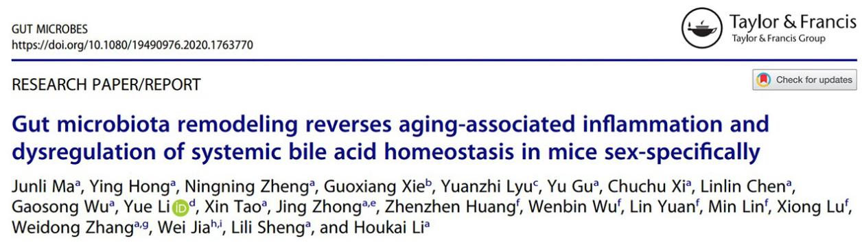 近日,我校交叉科学研究院李后开团队在国际微生物学专业期刊Gut Microbes(一区,IF=7.823)在线发表了题为《肠道菌群重塑性别依赖性地改善老年小鼠的体内炎症与胆汁酸稳态失衡》(Gut microbiota remodeling reverses aging-associated inflammation and dysregulation of systemic bile acid homeostasis in mice sex-specifically)的研究论文。