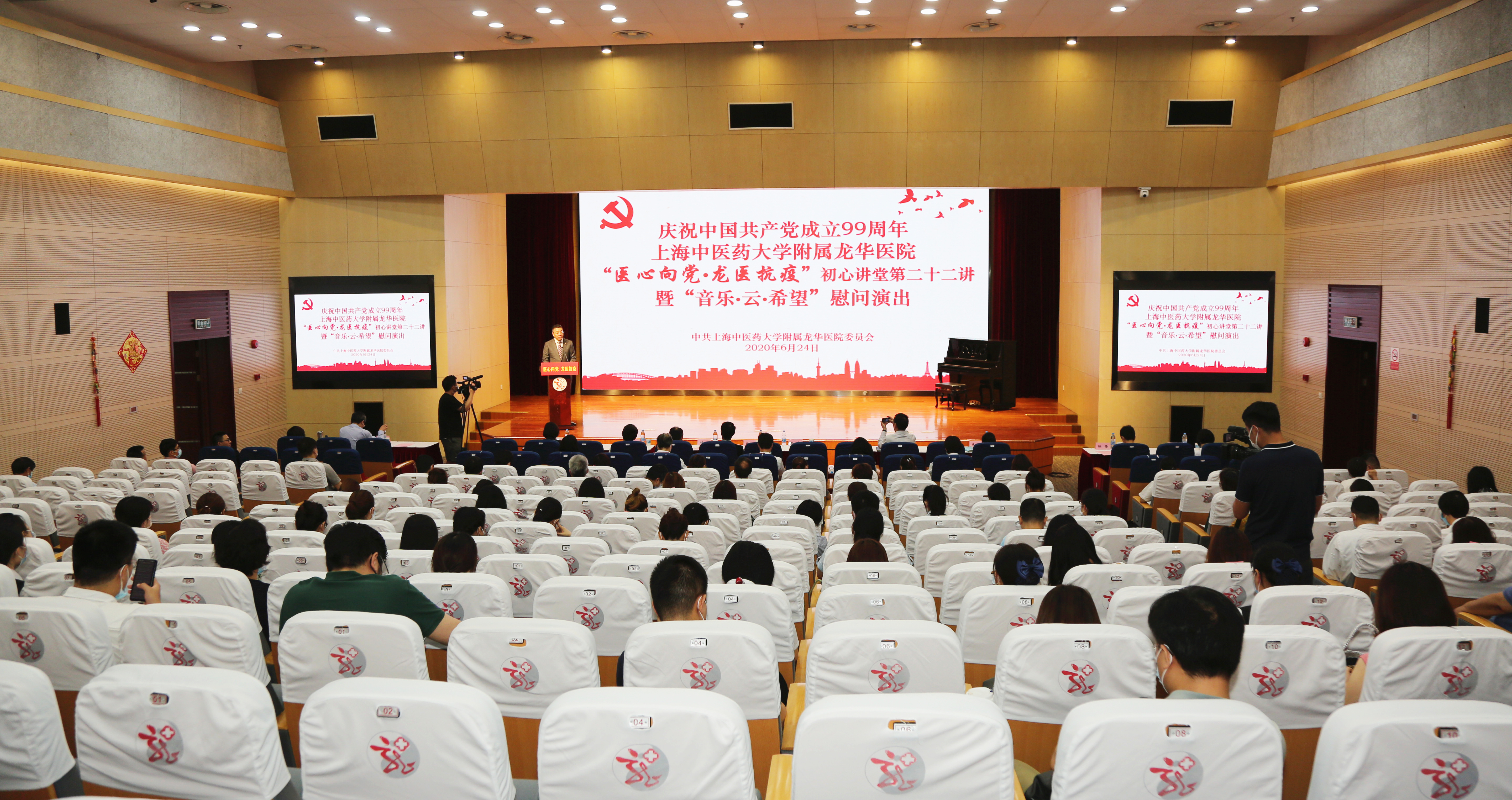 6月24日,为庆祝中国共产党成立99周年,附属龙华医院“医心向党•龙医抗疫”初心讲堂第二十二讲暨“音乐•云•希望”慰问演出在龙华医院远志楼三楼会议室举行。我校副校长杨永清,上海爱乐乐团、上海师范大学人文学院、工商银行上海市徐汇支行、龙华烈士纪念馆等多家党建共建单位领导,龙华医院党政领导班子、职能科室负责人、支部书记及党员代表、民主党派及统战团体代表等近150人参加现场会议。特殊时期,本次大会采用了线上线下相结合的方式,广大党员、学生、职工、党建共建单位成员等3700余人通过网络直播在线听课。