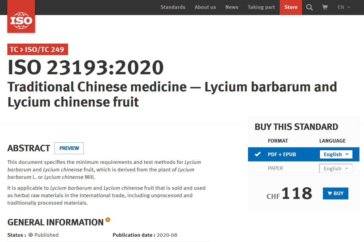 近日,国际标准化组织(ISO)正式发布了《中医药-枸杞子》国际标准(ISO 23193:2020 Traditional Chinese medicine –Lycium barbarum and Lycium chinense fruit),该标准由我校王峥涛教授领衔,石燕红副研究员(提案人)、杨莉研究员、王瑞教授等组成的中药标准化研究团队主导制定。