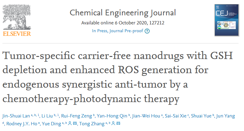近日,我校中药学科张彤教授课题组在抗肿瘤中药活性成分藤黄酸(gambogic acid,GA)新型无辅料纳米给药系统研究中取得重要突破,成功构建了一种新型无载体纳米制剂(GA-Ce6-FA),为未来提高中药调节肿瘤微环境能力,开展中西协同光动力临床治疗方案提供了可能。该项研究成果Tumor-specific carrier-free nanodrugs with GSH depletion and enhanced ROS generation for endogenous synergistic anti-tumor by a chemotherapy-photodynamic therapy发表在国际顶级学术期刊Chemical Engineering Journal(6 Oct 2020,DOI: https://doi.org/10.1016/j.cej.2020.127212)。