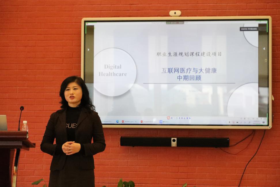 舒静介绍互联网医疗与大健康项目背景,她指出,互联网医疗与大健康项目作为《大学生职业规划》课程建设项目应运而生,学校整合导师团、校友、优质企业等多方资源,以互联网医疗与大健康发展的探究剖析,构画了职业生涯教育的课程内涵建设。