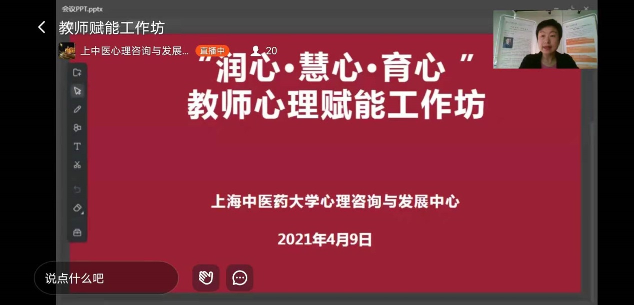 为保障学生健康成长,将“我为群众办实事”实践活动贯穿党史学习教育全过程。4月9日至4月23日,上海中医药大学心理咨询与发展中心联合上海市社会心理学会青少年心理健康专业委员会,举办2021年度“润心·慧心·育心”心理健康教育活动月之教师心理赋能工作坊,以强化心理健康队伍建设,助力心理工作提质增效,共同构建心理育人氛围。心理咨询与发展中心主任成琳主持开班仪式。