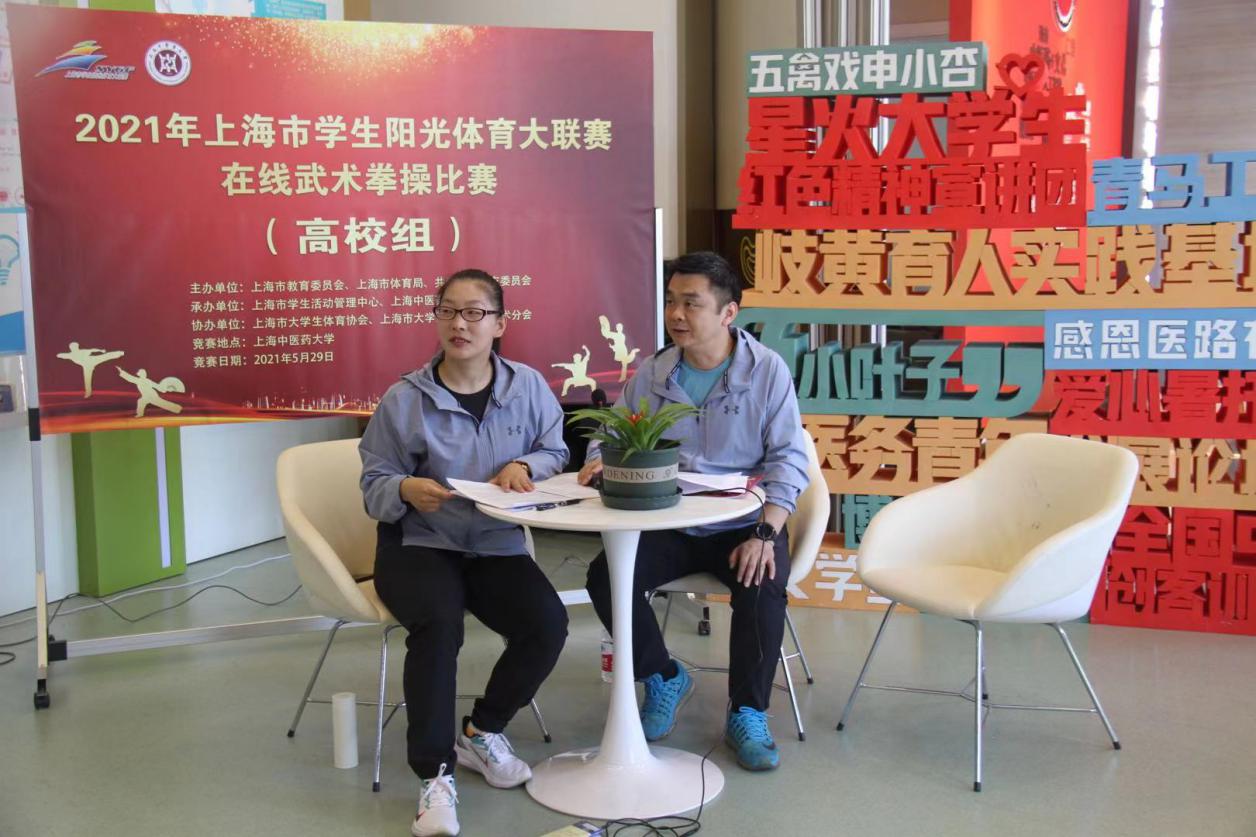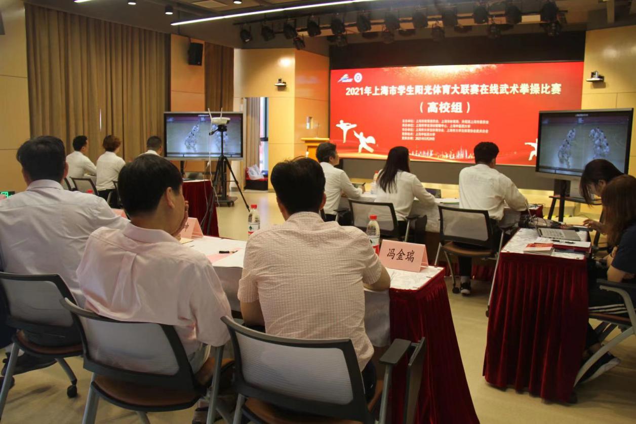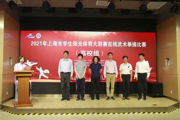 5月29日上午,2021年上海市学生阳光体育大联赛武术拳操比赛在我校以直播形式在线举行。此次比赛由上海市教育委员会、上海市体育局、共青团上海市委员会主办。来自沪上14所高校的343名学子参加此次比赛。比赛由各单位提前录制视频上传,根据抽签顺序安排视频现场播放,裁判组成员统一在线观看视频后进行打分。上海市教委体卫艺科处副处长时多,上海市学生活动管理中心副主任盛炯、体育部副部长黄孙巍,上海师范大学教授张福云,上海体育学院教授刘同为,上海师范大学教授高幕峰,我校体育部主任吴志坤、体育部传统保健体育教研室主任冯金瑞等出席比赛开幕式。