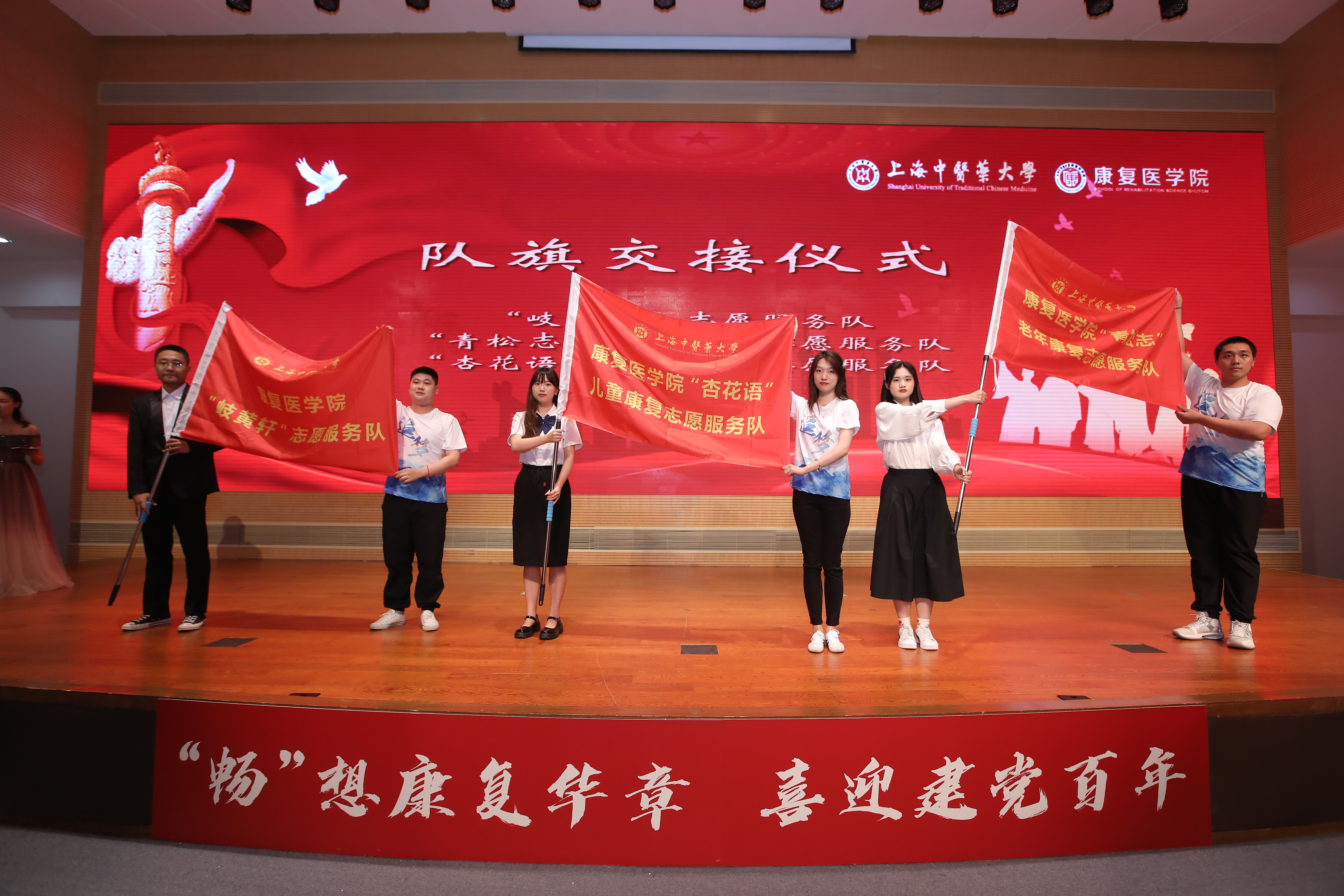 在校生代表从毕业生手中当众接过“岐黄轩”志愿服务队、“青松志”老年康复志愿服务队、“杏花语”儿童康复志愿服务队队旗,意味着他们接过康复医学院11年矢志育人、不忘济世的志愿服务初心,更是党和国家对大学生接续奋斗、砥砺前行的期待。