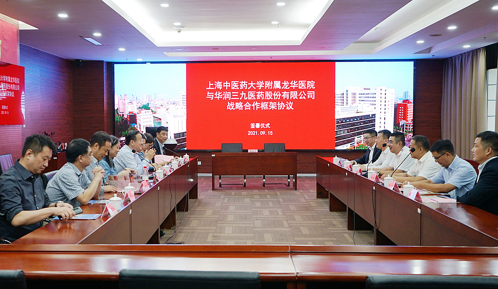 9月15日,上海中医药大学附属龙华医院与华润三九医药股份有限公司战略合作框架协议签署仪式在龙华医院12号楼会议室举行,我校校长徐建光、对外联络处处长郑林贇、医院管理处处长陈昕琳,上海市中医药管理局中医药传承发展处一级调研员姚玮莉,双方主要领导参加签约仪式。此次签约为双方构建紧密合作伙伴关系打下了基础,也标志着龙华医院申报国家医学中心的工作又向前迈进了一大步。