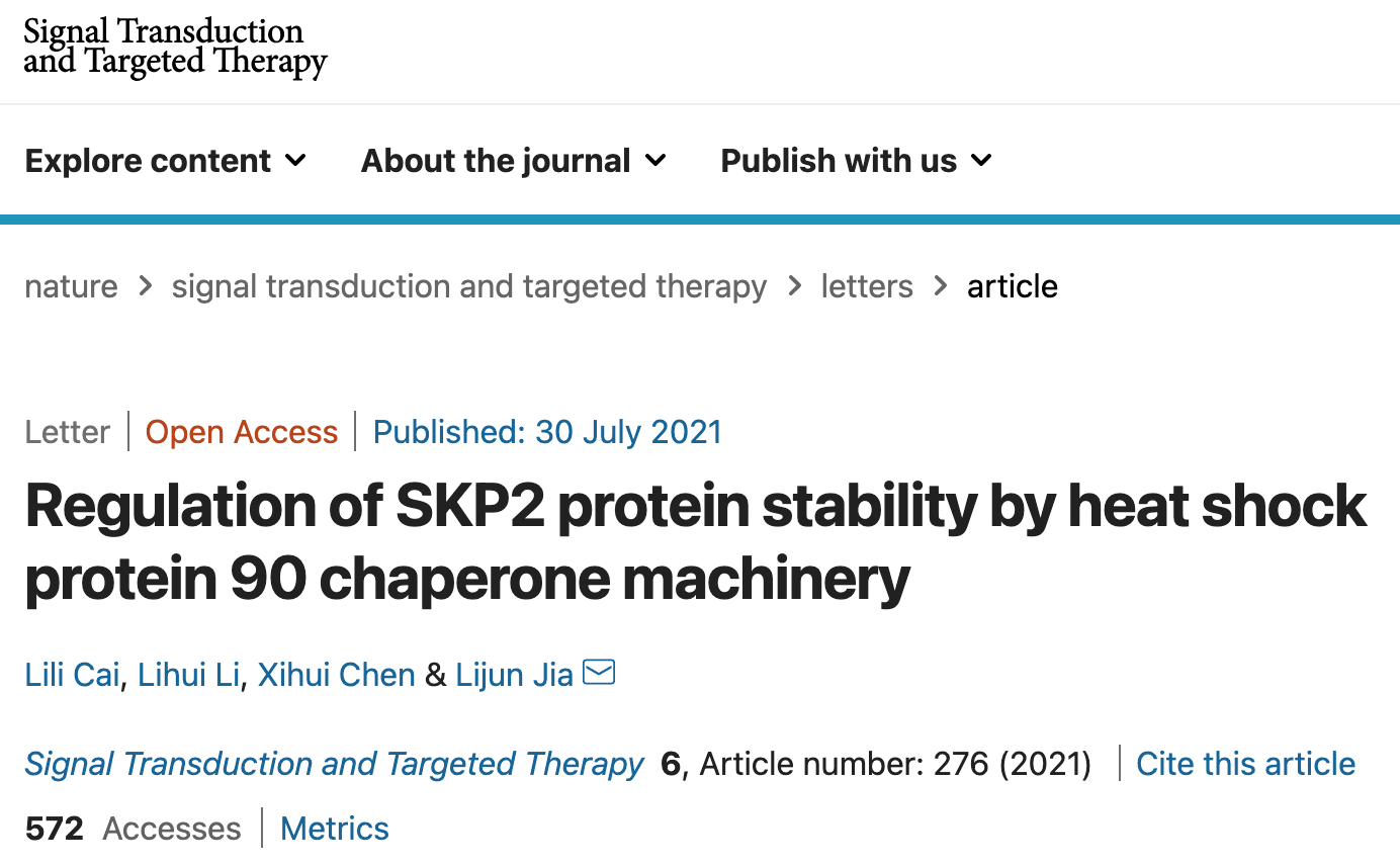 近日,我校附属龙华医院贾立军团队在权威学术期刊Signal Transduction and Targeted Therapy发表了题为Regulation of SKP2 protein stability by heat shock protein 90 chaperone machinery的研究论文,该研究揭示了促癌蛋白SKP2泛素连接酶受HSP90分子伴侣调控,而靶向抑制HSP90抗肿瘤治疗会介导SKP2的蛋白酶体降解。鉴于HSP90和SKP2在多种人类肿瘤中显著高表达、并与肿瘤发生发展密切相关,该研究揭示了一种SKP2的上游调控新机制以及靶向HSP90下调SKP2的抗肿瘤治疗新策略,并为靶向HSP90-SKP2通路抗癌中药单体筛选提供了新靶标。