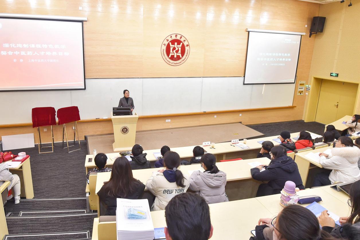 我校副校长舒静以“深化炮制课程特色教学、契合中医药人才培养目标”为主题,为师生们讲授课程第一课引用《太平圣惠方》中的“凡合和汤药、务在精专”,强调潜心学习的重要性同时对炮制教学团队不断尝试产教融合表示肯定勉励学生们在匠心制药、掌握炮制精髓的基础上创造发明。我校首席教授、中药研究所所长王峥涛结合数十年科学研究经验,深入浅出地传授炮制技术创新科学研究的新思维。我校客座教授、上海中药行业协会会长杨弘介绍中药质量溯源工程的重要意义,为学生们打开炮制技术传承创新与中药产业发展的新视野。