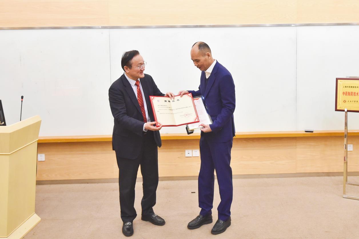 徐建光向国家级非遗项目中药炮制技艺(人参炮制技艺)传承人、福参源保健品有限责任公司董事长王俊良颁发客座教授聘书并为其佩戴校徽王俊良向上海中医药大学捐赠2支野山参珍品作为上海中医药博物馆藏品陈列展示。