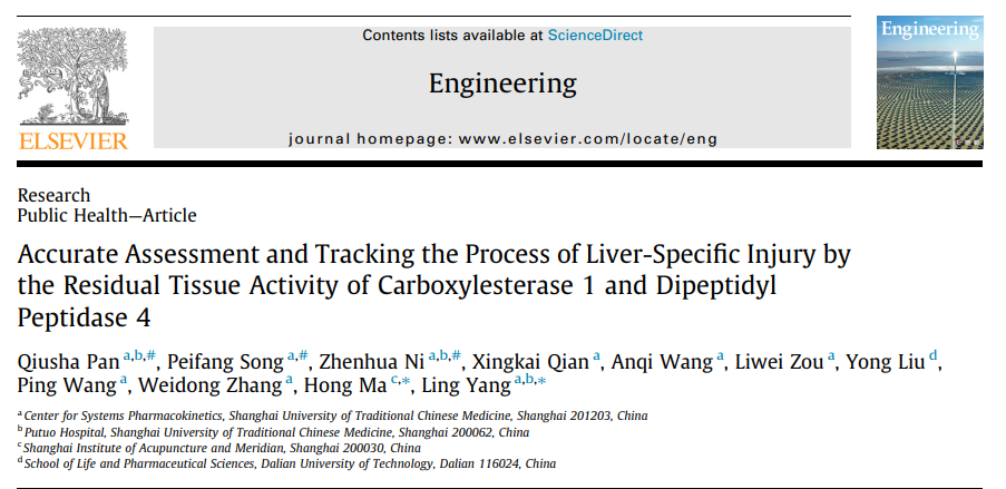近日,我校杨凌团队创新性地发明了一种损伤性标志物的判定方法,该研究成果Accurate Assessment and Tracking the Process of Liver-Specific Injury by the Residual Tissue Activity of Carboxylesterase 1 and Dipeptidyl Peptidase 4近期正式在线发表于知名期刊Engineering。