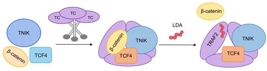 该研究另一个主要发现是TRAF2在Wnt/β-catenin信号通路中的关键作用。作者首先证实了TRAF2是Wnt信号通路的正性调控因子,并通过大量的蛋白互作实验,证实了TRAF2与β-catenin、TCF4以及TNIK形成一个四联复合物,且TRAF2是四联复合物的关键支架蛋白(图2)。有趣的是,LDA不仅破坏TRAF2与β-catenin的结合,也显著阻断β-catenin与TCF4 2的结合,进一步表明TRAF2在β-catenin/ TCF4复合物中的重要性(图2)。总之,本研究不仅揭示了中药路路通活性分子LDA抑制Wnt信号通路和结肠癌的活性,并且发现了LDA靶标蛋白TRAF2是β-catenin/TCF4/TNIK转录复合物的关键支架蛋白,彰显了基于中药化学小分子阐明生物大分子功能的优越性,为中药活性成分功能靶标鉴定提供了新思路。