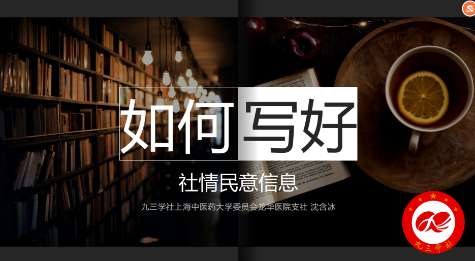 本次讲座聚焦“如何写好社情民意信息”主题,邀请附属龙华医院中医传统治疗部主治医师、九三学社上海市委参政议政师资库讲师、我校九三学社社员沈含冰主讲,学校各民主党派成员共50余人参加。校九三学社主委张悦主持。