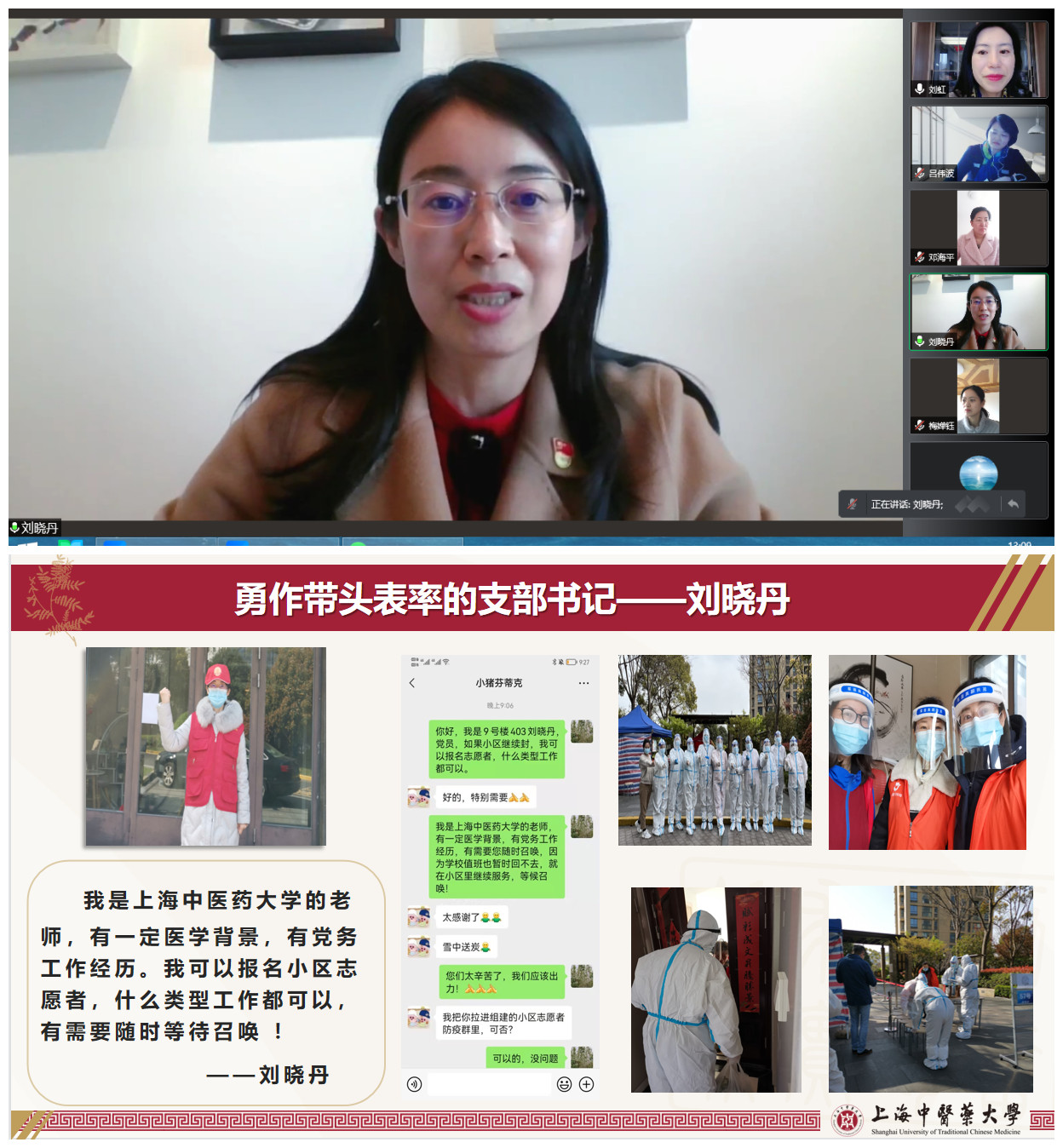 康复医学院刘晓丹是一位基层党支部书记,她在此轮疫情中第一时间报名加入社区防疫志愿者队伍,协助开展居民服务工作。