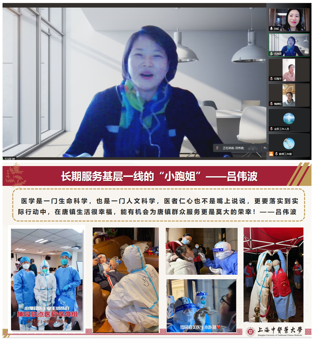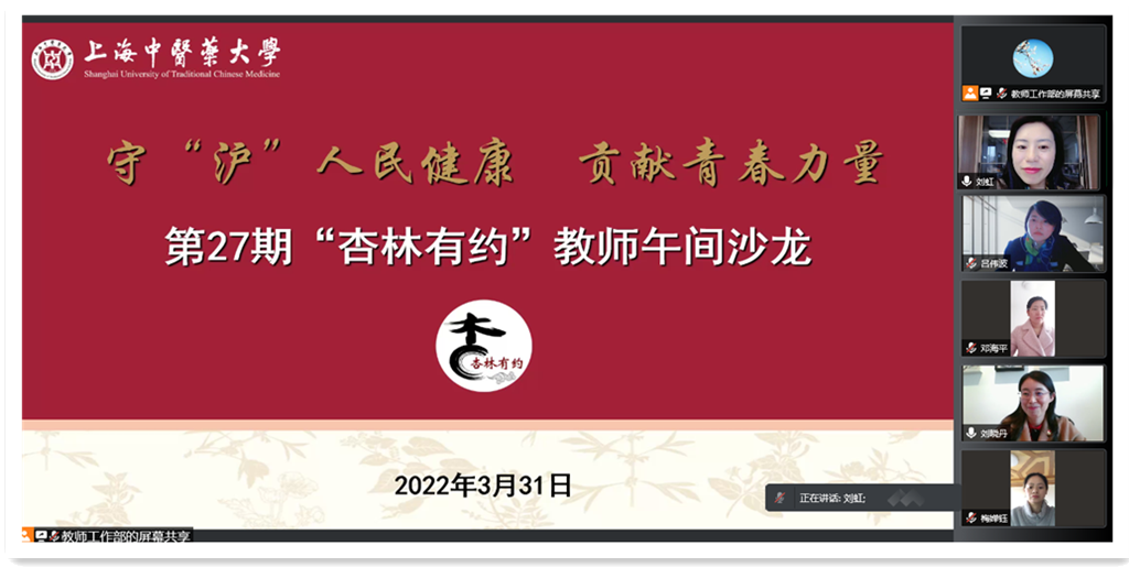 3月31日中午,第27期“杏林有约”教师午间沙龙活动“云上相约”,围绕“守‘沪’人民健康 贡献青春力量”主题,四位教师受邀讲述在抗疫过程中发生的感人故事,分享所闻所思所感。校宣传部(党委教师工作部)副部长刘虹主持本次活动,一百余名教师线上参会。