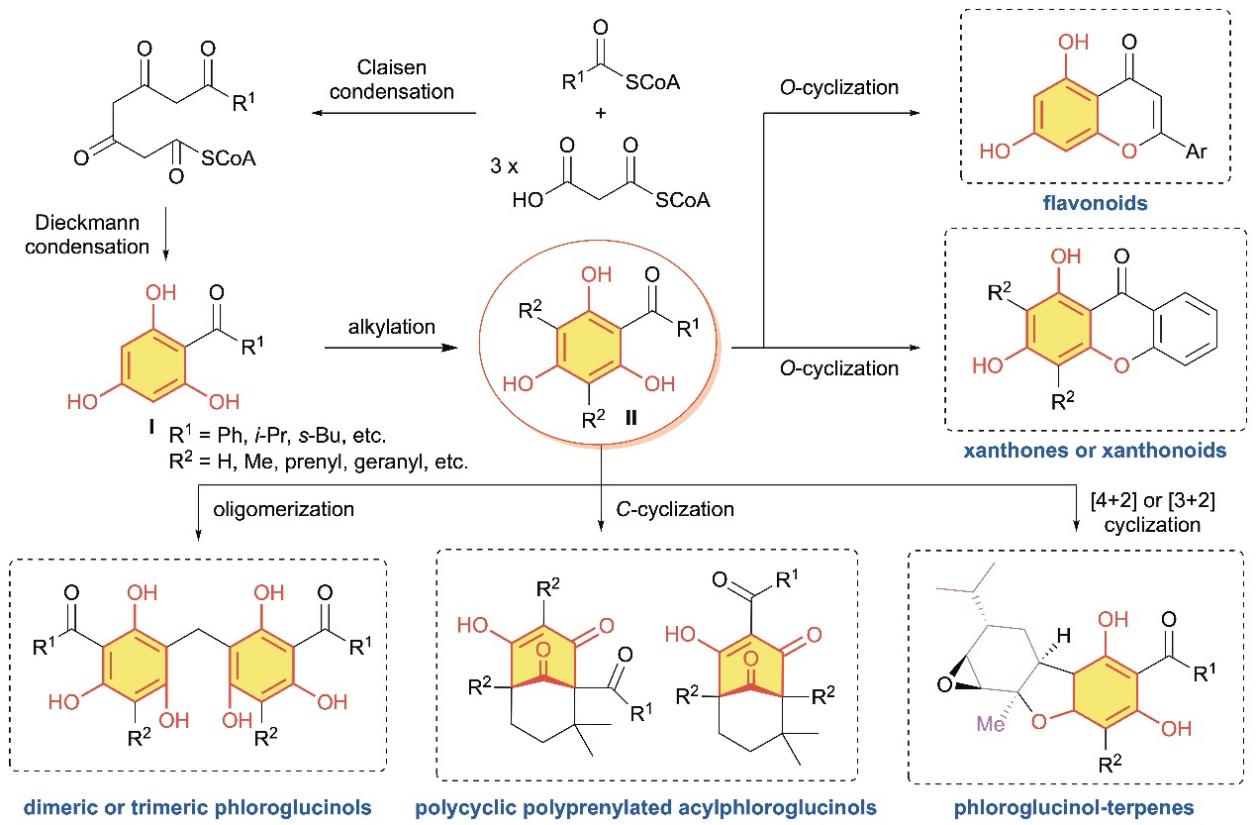 近日,我校首席教授徐宏喜团队受邀在天然产物研究领域顶级期刊Natural Product Reports发表题为Recent advances in the synthesis of natural products containing the phloroglucinol motif的综述。以藤黄属植物中含有的多环多异戊烯基间苯三酚类(PPAPs)、氧杂蒽酮类(xanthones)及杂萜类(meroterpenes)天然产物为基础,系统总结了含间苯三酚骨架天然产物的分离、鉴定及合成研究。