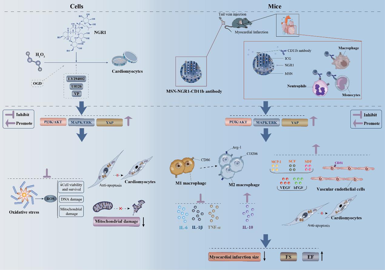 MSN-NGR1-CD11b抗体纳米粒能有效改善心功能,减少心肌细胞凋亡,诱导巨噬细胞向M2极化,促进血管生成,减少梗死部位的炎症反应。同时,该研究通过体外和体内实验发现,NGR1保护心肌细胞的作用机制与激活AKT和MAPK信号通路及促进YAP核移位有关。总之,该研究为中药NGR1防治心肌缺血损伤提供更多实验依据,也为心肌缺血药物靶向治疗提供新策略。