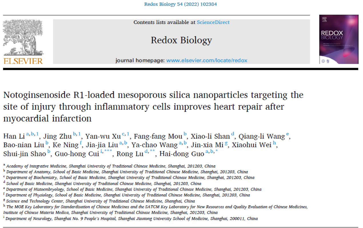 近日,我校中西医结合研究院国海东研究员和基础医学院吕嵘教授团队在三七皂苷R1(NGR1)靶向治疗心肌缺血损伤的作用及机制上取得重要进展,研究成果Notoginsenoside R1-loaded mesoporous silica nanoparticles targeting the site of injury through inflammatory cells improves heart repair after myocardial infarction发表于Redox Biology杂志。