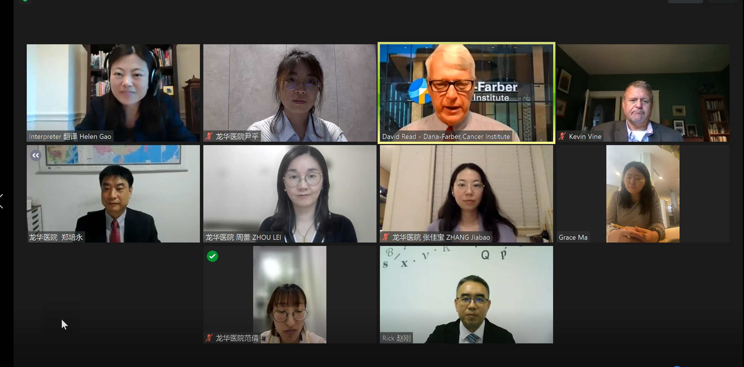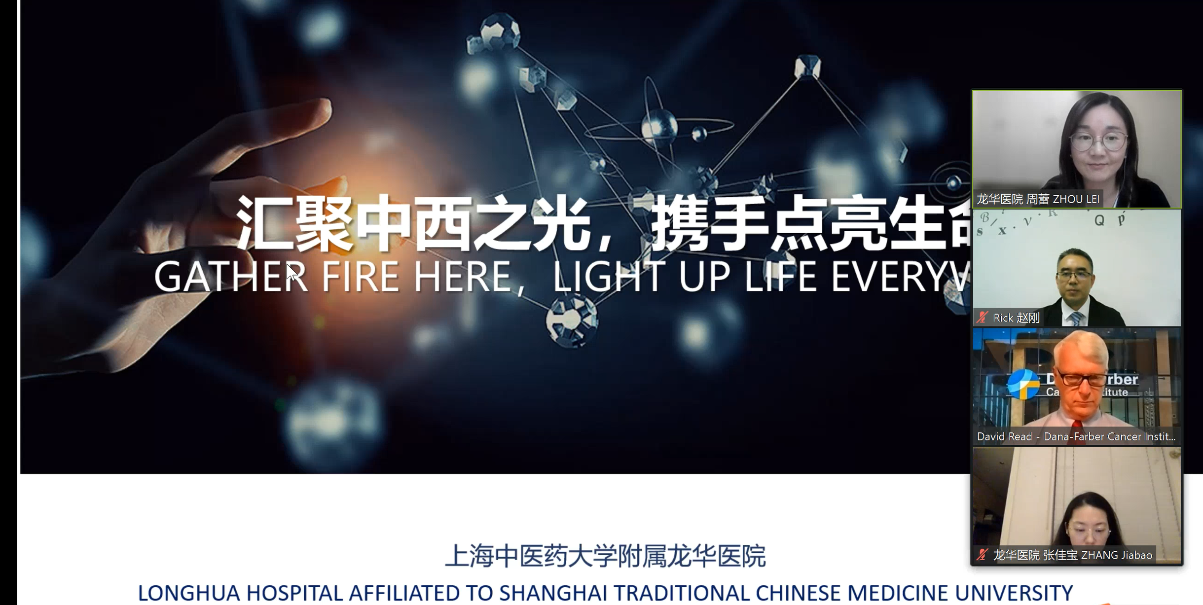 为进一步推进中医药国际交流合作,加强学科内涵建设,为申报和建设国家医学中心建设项目打好坚实的基础,6月27日,我校附属龙华医院与美国哈佛大学医学院附属丹娜-法伯癌症研究所举办国际学术线上交流研讨会。美国哈佛大学医学院附属丹娜-法伯癌症研究所门诊医护运营和肿瘤内科学部副总裁Mr. David Read、数字传播主任Mr. Kevin Vine、国际市场营销与传播专员Ms. Grace Ma,我校附属龙华医院副院长郑培永、主任医师周蕾、副主任医师尹平、医生张佳宝等出席会议。