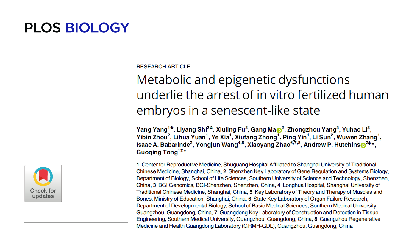 近日,我校附属曙光医院生殖医学中心童国庆研究团队和南方科技大学Andrew P. Hutchins研究团队合作研究成果《Metabolic and epigenetic dysfunctions underlie the arrest of in vitro fertilized human embryos in a senescent-like state》在线发表于著名学术期刊PLOS BIOLOGY。