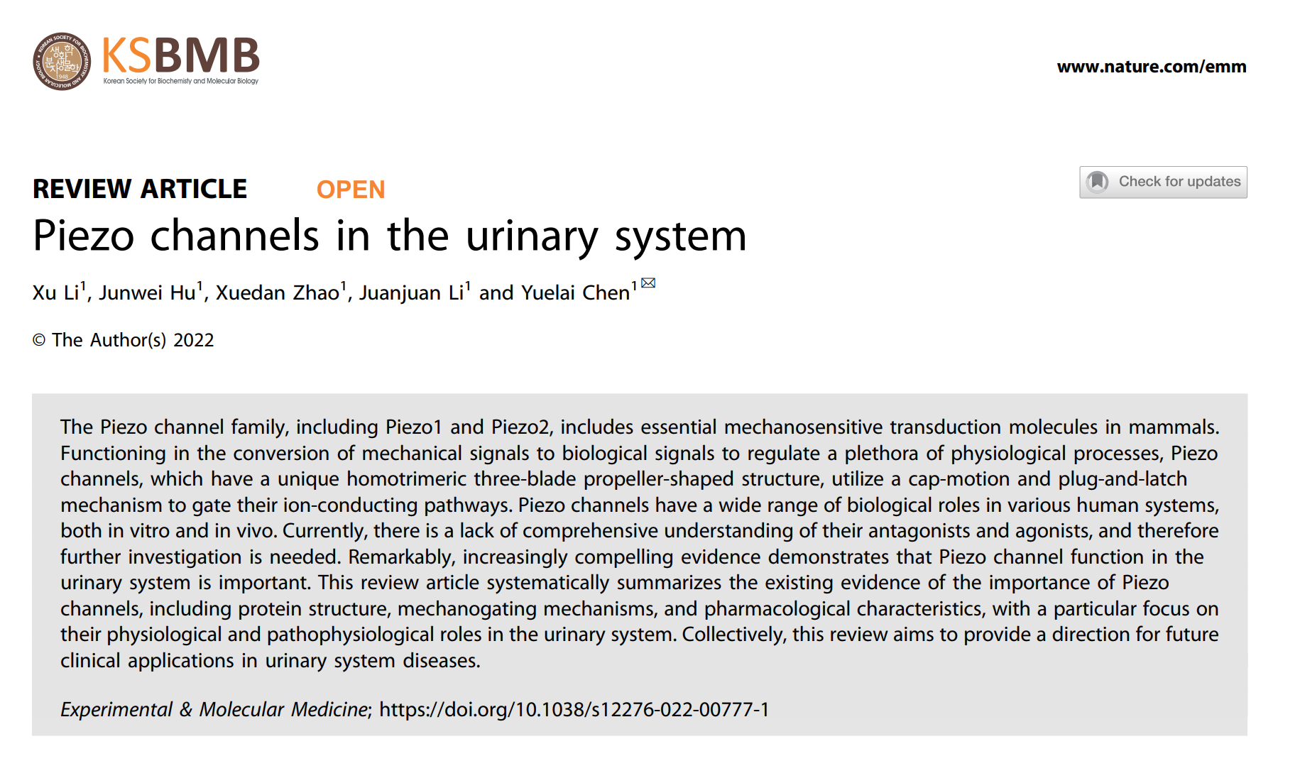近日,我校附属龙华医院陈跃来教授团队在国际著名期刊《Experimental & Molecular Medicine》发表题为“Piezo channels in the urinary system”综述文章。