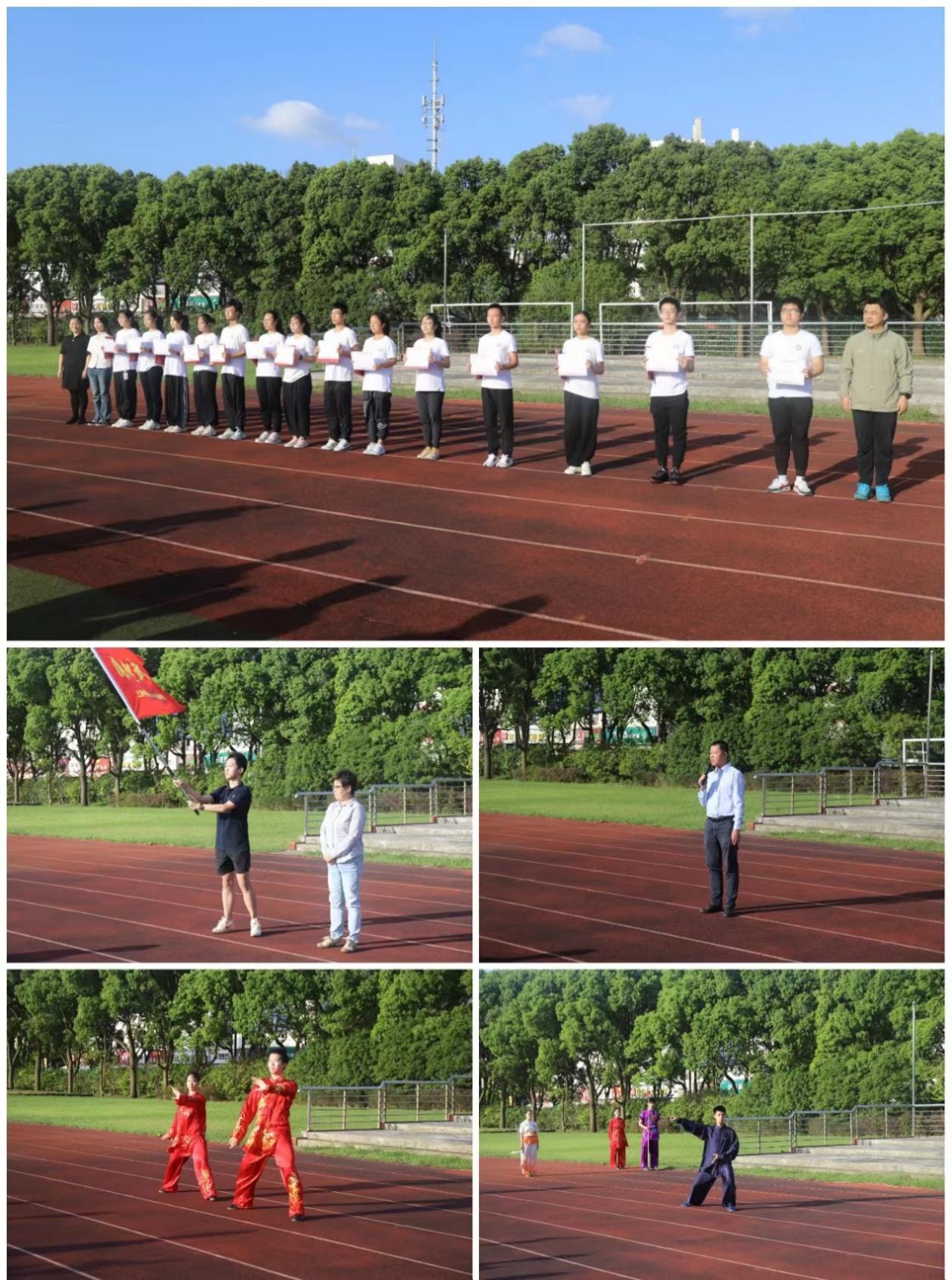 仪式在武术特长生带来的“闻鸡起武”功法展演中拉开帷幕。2021-2022学年“闻鸡起武”优秀学员作《八段锦》汇报展示,并齐声诵读《大医精诚》章节,全面展示学生们在经典诵读和功法学习上的成果。汇报展示结束后,与会老师为2021-2022学年优秀学员颁发证书。随后,基础医学院党委书记夏文芳宣布开训并为“闻鸡起武”活动授旗,2022级新生代表欧阳冠夫接旗。基础医学院副院长李海峰作题为“经典领航 德艺双修”的主题演讲,强调“闻鸡起武”不仅是为了强身健体,更能陶冶情操。他希望学生们勤读中医经典、勤练保健功法,培养积极向上、朝气蓬勃的内在修养和格局风度,凝聚中华优秀传统文化“精气神”,成长为“德艺双修”的苍生大医。开训仪式后,体育部国际武术交流中心主任王宾带领学生们练习功法《八段锦》。