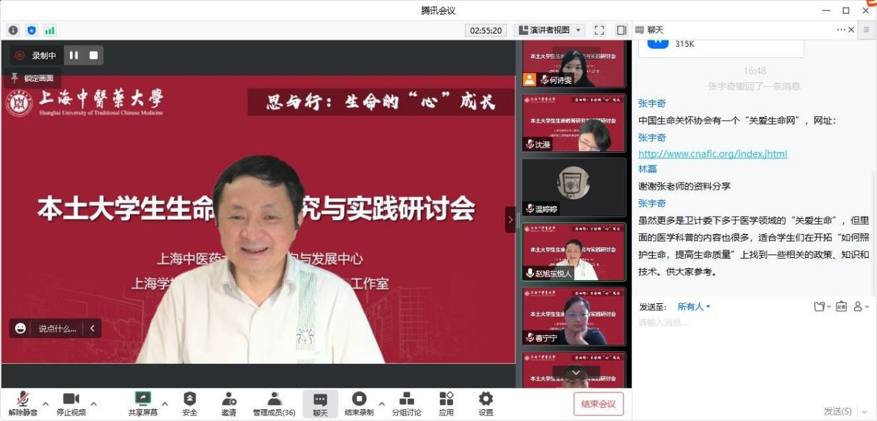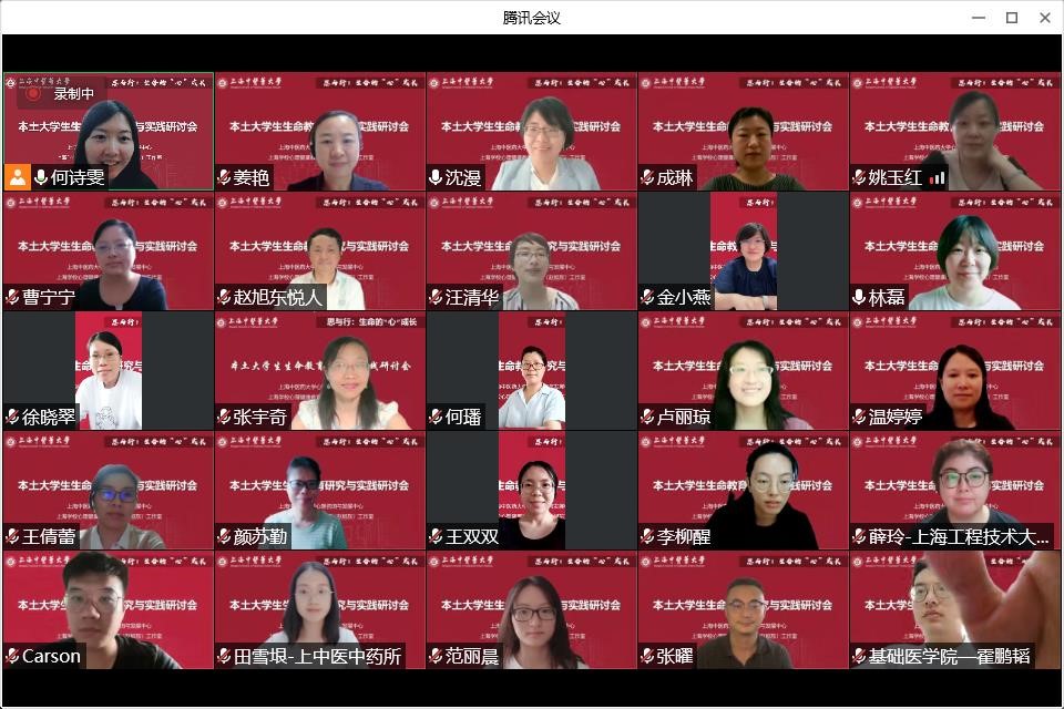 近日,“思与行:生命的‘心’成长”本土大学生生命教育研究与实践研讨会线上召开。上海市“中国生命智慧与实践”心理示范中心专题培训班成员、上海学校心理健康教育名师(赵旭东)工作室成员、上海中医药大学辅导员参会。研讨会由我校学工部(研工部)部长沈漫主持。