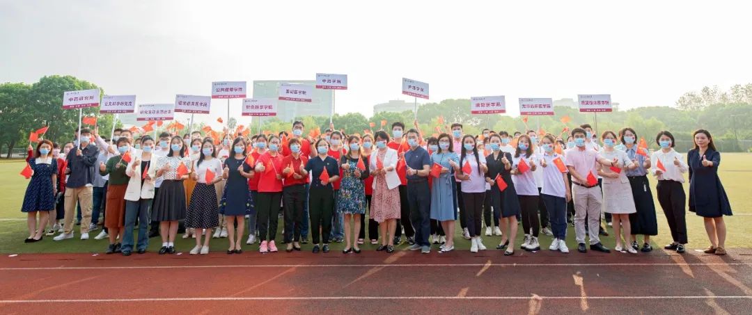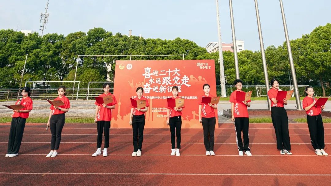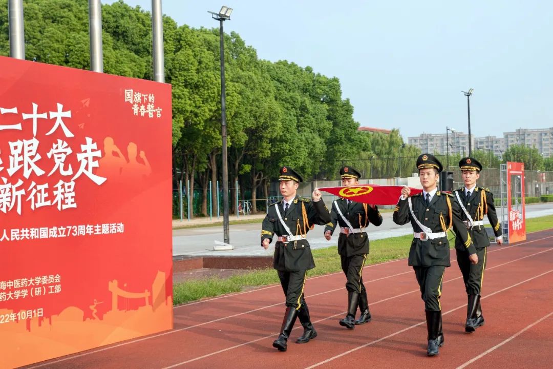 朝阳初升,红旗飘扬。在上海中医药大学的操场上,升旗仪式在《中国人民解放军进行曲》中拉开帷幕。随着雄壮的国歌声响起,鲜艳的五星红旗冉冉升起。师生代表面向国旗肃立致敬,在场师生齐声高唱《中华人民共和国国歌》,表达对伟大祖国母亲无限的热爱和深深的祝福。