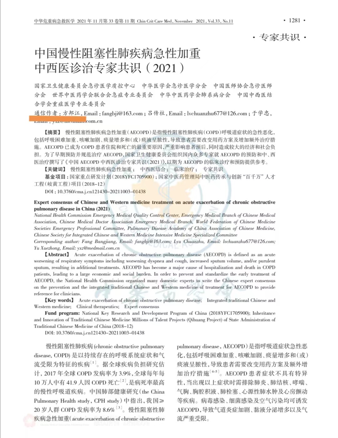 2021年牵头组织国家卫生健康委员会急诊质控中心、中华医学会急诊分会、中国医师协会急诊医师协会、世界中医药学会联合会急症专业委员会、中华中医药学会肺系病分会、中国中西医结合学会重症医学专业委员会业界知名中医、西医专家100余名,国家卫生健康委员会急诊质控中心主任、中国医师协会急诊医师分会会长于学忠教授、中华医学会急诊分会主任委员吕传柱教授、中华中医药学会肺系病分会主任委员张洪春教授对共识制定发挥了重要作用,专家们就中国慢性阻塞性肺疾病急性加重期现状、预防、中医和西医诊治进行广泛讨论,制定了《中国慢性阻塞性肺疾病急性加重中西医诊治专家共识(2021)》,以期为我国慢性阻塞性肺疾病急性加重期中、西医诊治提供临床参考和指导。该共识于2021年11月发表在知名学术期刊《中华危重病急救医学杂志》,在中、西学界产生广泛影响,为我国慢性阻塞性肺疾病急性加重期防治作出了重要贡献。