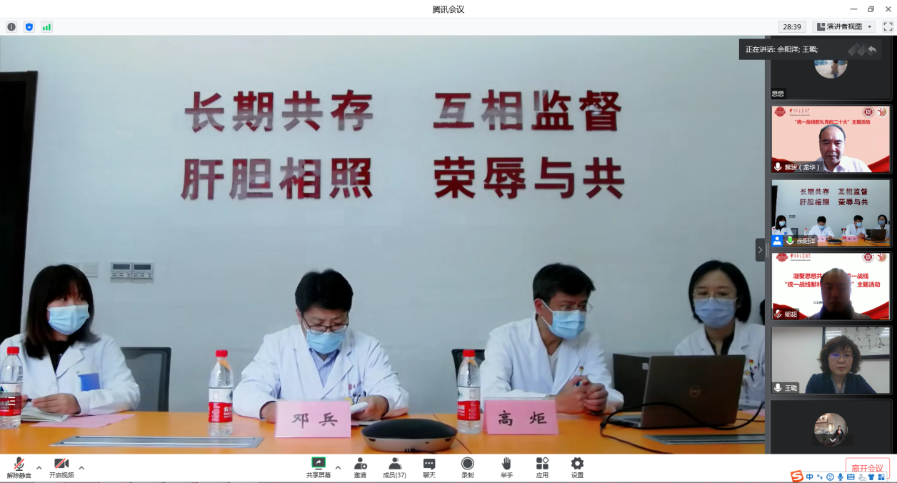 为深入学习贯彻习近平总书记关于做好新时代党的统一战线工作的重要思想,进一步落实中央统战工作会议精神,加深我校民建会员对中国共产党统一战线政策的学习和认识,迎接中国共产党第二十次全国代表大会的胜利召开,10月12日下午,中国民主建国会上海中医药大学委员会举行“凝聚思想共识,筑牢统一战线统一战线献礼党的二十大”主题活动。校党委常委、组织部(统战部)部长王璐,附属龙华医院党委副书记、纪委书记高炬,校统战部副部长严月华,校民建主委蔡骏出席。会议以线上线下相结合的方式进行,主会场设在龙华医院“民建会员之家”,会议由民建龙华医院支部主委邓兵主持。