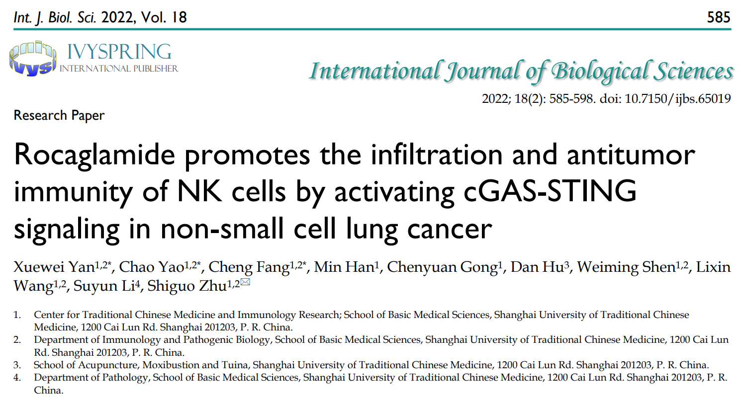 近日,我校基础医学院朱诗国研究员团队发现促进NK细胞肿瘤浸润的中药有效成分,研究成果Rocaglamide promotes the infiltration and antitumor immunity of NK cells by activating cGAS-STING signaling in non-small cell lung cancer发表于国际期刊International Journal of Biological Sciences。该研究成果对于促进楝酰胺在肿瘤免疫治疗中的应用及其新药研发具有重要意义。