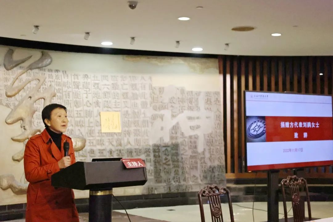 大国学编纂工作委员会副总干事刘鹃作为捐赠方代表发言,期望本次藏书捐赠能为上海中医药大学的教学、科研以及国家中医药事业的高质量发展贡献绵薄之力。