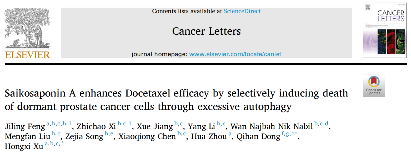 近日,上海中医药大学首席教授徐宏喜及席志超副研究员等在Cancer Letters杂志上发表题为Saikosaponin A enhances Docetaxel efficacy by selectively inducing death of dormant prostate cancer cells through excessive autophagy的研究论文。该文章的第一作者为冯极灵博士后和席志超副研究员,通讯作者为徐宏喜教授和悉尼大学董其瀚教授。该研究工作得到国家自然科学基金、中国博士后基金和广东省重点领域研发计划等资助。
