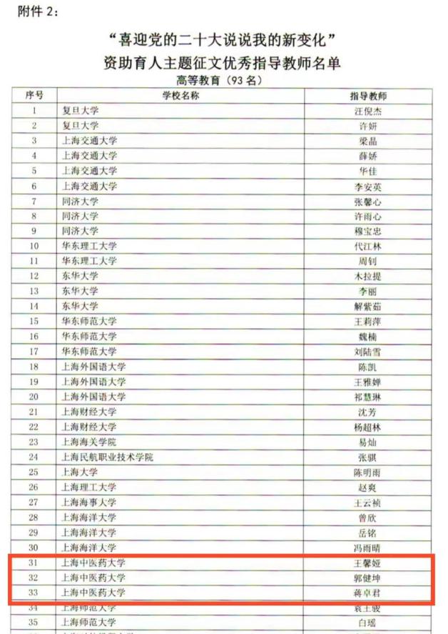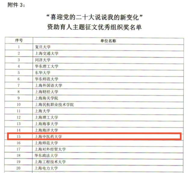 近日,上海市学生事务中心公布了“喜迎党的二十大 说说我的新变化”资助育人主题征文的评选结果,上海中医药大学获得佳绩。我校三位学生分获二等奖1项、三等奖2项,三位教师获评为“高等教育组优秀指导教师”,我校获“优秀组织奖”。