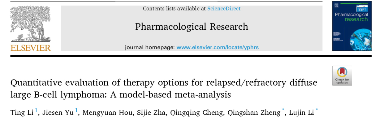 近日,我校交叉科学研究院郑青山和李禄金团队开展的复发/难治性弥漫大B细胞淋巴瘤治疗方案的模型化定量评价研究Quantitative evaluation of therapy options for relapsed/refractory diffuse large B-cell lymphoma: A model-based meta-analysis在国际著名药理学杂志Pharmacological Research发表。
