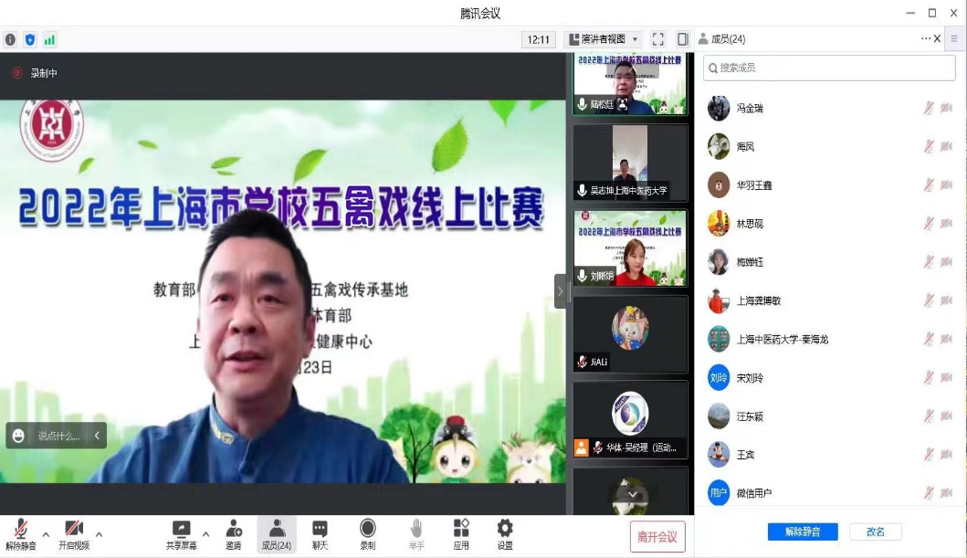为促进中华优秀传统文化五禽戏传承基地发展,进一步推动五禽戏传承学校的传承引领作用,由教育部中华优秀传统文化五禽戏传承基地、上海中医药大学体育部、太极健康中心共同主办的2022年上海市学校五禽戏线上比赛于12月23日在云端举行。此次比赛共吸引了来自上海中医药大学附属晶城中学、浦东新区观澜小学、浦东新区东荷小学、浦东新区福山外国语小学、青浦区崧泽小学、金桥镇中心小学等五禽戏传承学校的200余名选手报名参赛。上海中医药大学体育部教授吴志坤、党支部书记龚博敏、主任陆松廷及相关教练员、裁判员出席此次开幕仪式,传统保健体育教研室主任冯金瑞担任本次比赛裁判长。