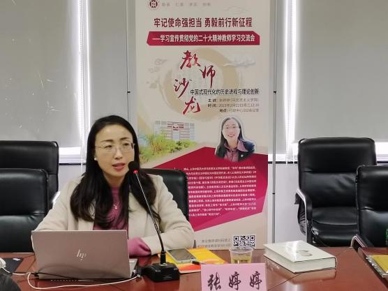 为持续深入学习宣传贯彻党的二十大精神,引导广大青年教师从党的二十大精神中汲取奋进的力量,2月22日下午,“牢记使命强担当 勇毅前行新征程——深入学习宣传贯彻党的二十大精神”专题系列第三期教师学习交流会暨第35期“杏林有约”教师午间沙龙在行政中心312会议室举办。我校“杏马”理论宣讲团成员、马克思主义学院副院长张婷婷副教授受邀作专题辅导报告,主题为“中国式现代化的历史进程与理论创新”。宣传部(党委教师工作部)副部长刘虹主持会议,并向张婷婷颁发“阳光导师”荣誉证书。教师党支部书记、青年教师班主任等40余位教师参加学习交流。