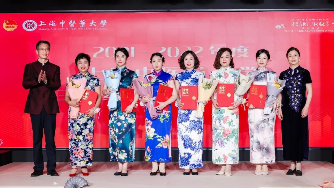 活动上还举行了上海中医药大学三八红旗手(集体)荣誉称号颁奖仪式,许铁峰宣读了获得2021-2022年度上海中医药大学三八红旗手(集体)荣誉称号的优秀个人及集体。朱惠蓉、许铁峰为受到表彰的优秀个人及集体代表颁发证书。今天受到表彰的教师个人和集体代表表示深受鼓励,要倍加珍惜荣誉、再接再厉,在各自岗位、各条战线上发挥引导、带动作用,为学校的科学发展、创新发展、跨越发展再立新功,再创佳绩。