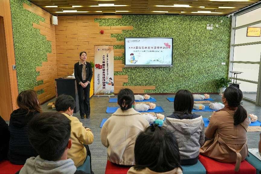在上海中医药大学附属普陀医院心内科王大英主任医师和实训中心的3位老师悉心指导下,学员们学习了成人、儿童、婴儿心肺复苏术,心脏电击除颤与AED操作使用,成人、婴儿气道梗阻处理方法与操作技术。培训方式采用原版AHA视频教学边看边练、技能考核、笔试。本次培训以实践操作为主,旨在培训老师学习规范的急救技能,完成课程并通过考核的学员将拿到国际上认证的“基础生命支持提供者证书”。课程强调操作的规范性及团队合作的重要性,通过不断地实操训练增强学员对知识点的掌握,切实提高学员在模拟情境下的紧急救治能力。
