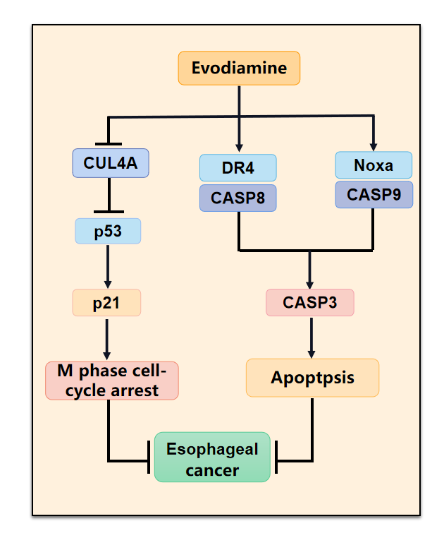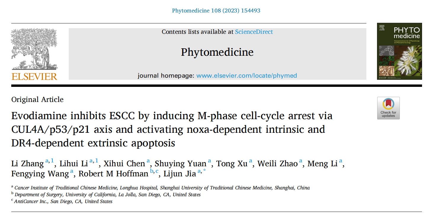 上海中医药大学附属龙华医院、上海市中医药研究院中医肿瘤研究所贾立军教授团队选取中药吴茱萸中主要活性成分——吴茱萸碱(Evodiamine,Evo),针对其抗食管癌效果及相关的分子调控机制,开展了深入研究。近期,团队以研究论文形式在国际权威期刊Phytomedicine上发表了最新研究成果Evodiamine inhibits ESCC by inducing M-phase cell-cycle arrest via CUL4A/p53/p21 axis and activating noxa-dependent intrinsic and DR4-dependent extrinsic apoptosis。