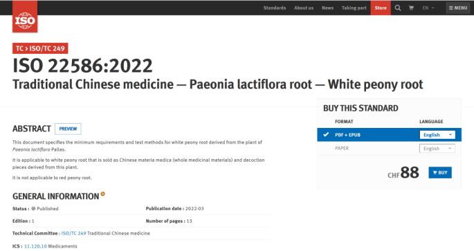 党参、白芍、板蓝根、当归、枸杞子,这些中药材的标准都是国际化的,均是由中国上海中药标准化研究团队主导制定与发布的大宗中药材ISO国际标准,主要从种源、性状、理化、安全性、检测方法及包装、存储等指标方面完成标准制定工作。
