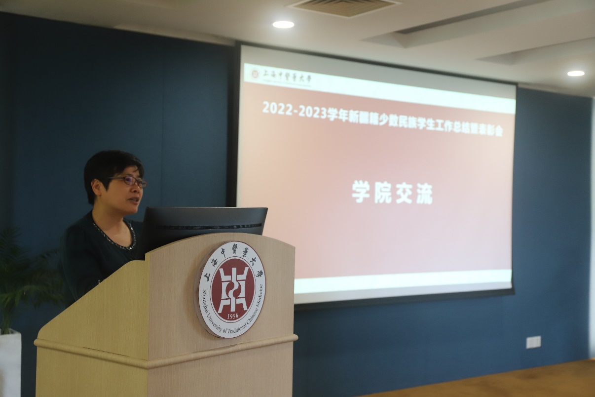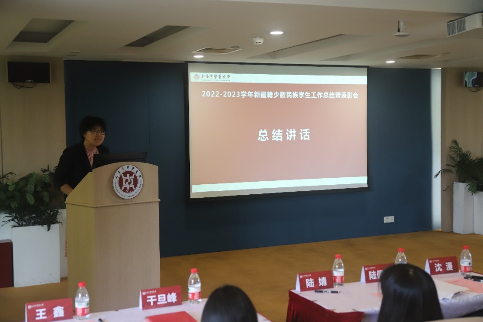 总结会上,专职辅导员关琳子对我校2022-2023学年的少数民族学生工作进行汇报。上海高校辅导员洪汉英工作室在过去的一年紧紧围绕铸牢中华民族共同体意识这一主线,以线上线下相结合的方式开展新生适应性教育,持续开展沪语培训和寒暑假社会调研,“一对一”开展就业指导,通过解决实际问题来解决思想问题,同时也取得了丰硕的成果。