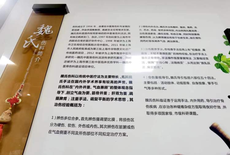 上海交通大学医学院附属瑞金医院魏氏伤科成立于1956年,是由著名中医骨伤科学家魏指薪教授创立的,是上海八大伤科之一,也是上海中医界15大顶级流派中唯一一个在三级甲等综合性医院中的中医骨伤科流派科室。2021年入选国家第五批非遗传统医药项目名录。