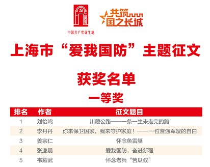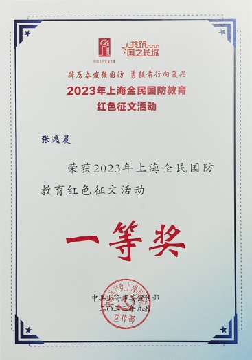 为大力弘扬伟大建党精神,讴歌军民团结关心国防、热爱国防、建设国防、保卫国防的深厚情感,上海市委宣传部等单位联合主办了上海市“爱我国防”主题征文活动。近日,评选结果揭晓,我校公共健康学院2021级预防医学专业张逸晨的作品荣获一等奖。