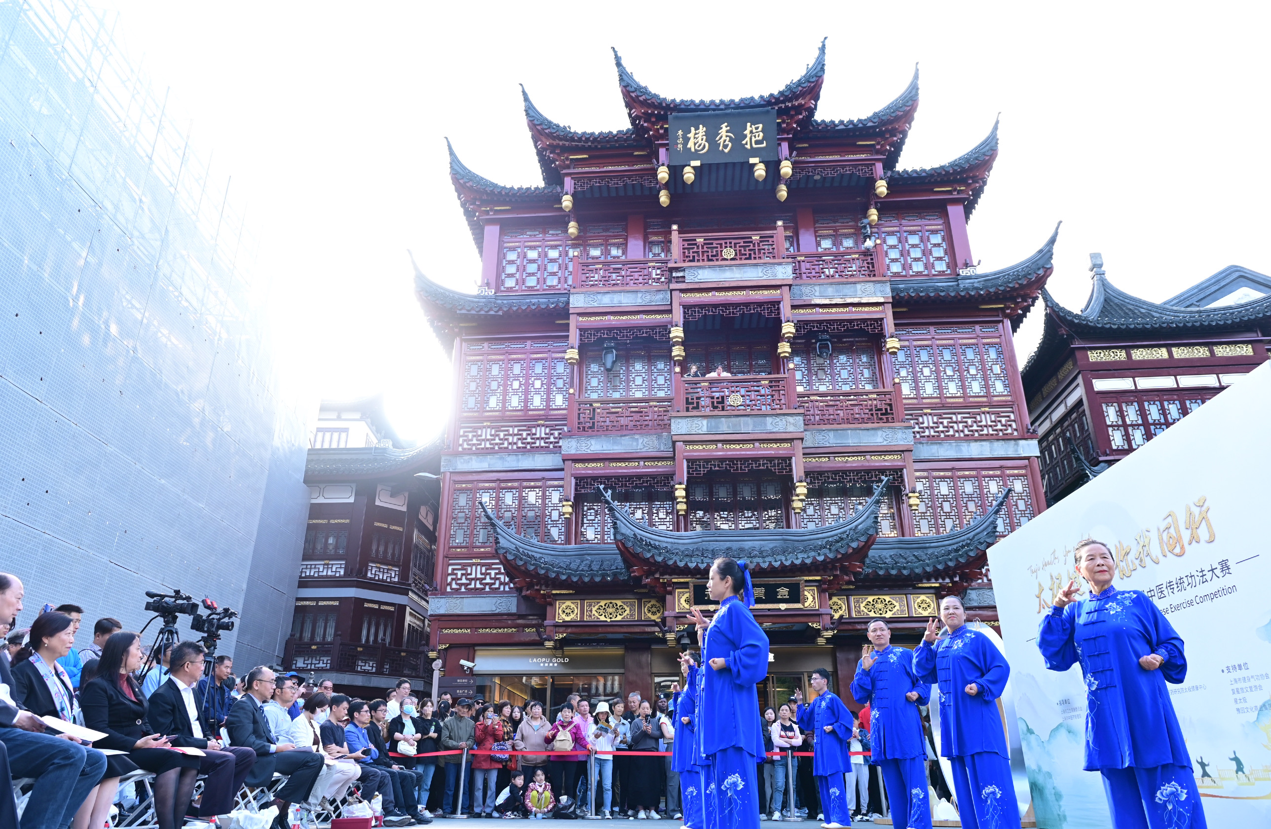 今天的海派文化地标豫园九曲桥广场游人如织,近处豫园的亭台楼阁与远处楼群摩天的陆家嘴交相辉映,在传统与现代的连接点,上海气功研究所气道书院外籍学员团队、上海中医药大学附属闵行蔷薇小学“五行操”团队以及复星集团旗下星太极进行传统功法展演,并与游客分享太极文化,体验非遗太极拳的抱手礼,一同感受优秀传统文化的魅力。
