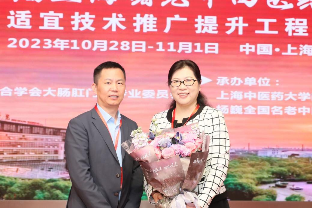 开幕式中,上海中医药大学附属曙光医院党委书记周强峰为杨巍教授献花,对她在肛肠科学术发展方面作出的贡献表示感谢。