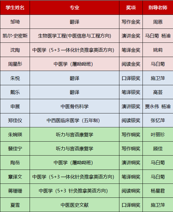 市赛前,学校于9月初组织了校赛,全校共244名本科生和研究生踊跃报名英语写作、演讲、笔译、阅读、口译五大分项赛。经过线上、线下层层激烈角逐,36名学生荣获校赛一、二、三等奖,其中14名学生脱颖而出,代表我校参加了市赛。此次大赛取得优异成绩,充分展现了我校学子努力拼搏、奋发向上的精神面貌,也体现了外语教学中心广大教师教书育人、勇担使命的工作成效。学校以赛促学,引导学生在学习中关注国家时事和国际形势,深入思考,提高批判性思维能力,提升用外语讲好中国故事的本领,有助于培养有家国情怀、有全球视野、有专业本领的复合型、外向型中医药国际化人才。
