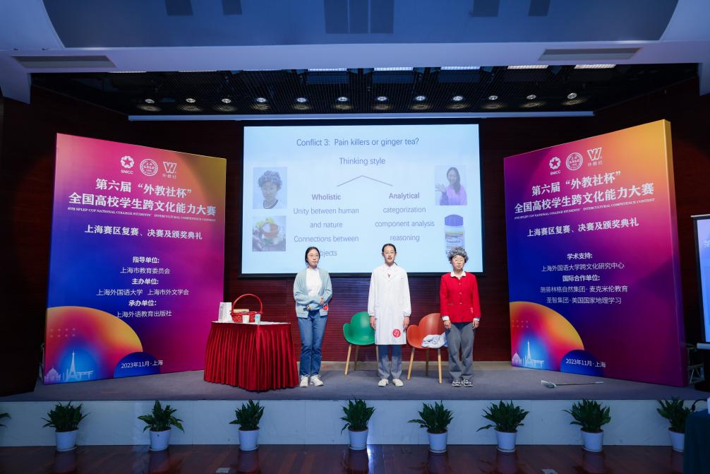 11月11日,第六届“外教社杯”全国高校学生跨文化能力大赛上海赛区比赛在上海外语教育出版社拉开帷幕。来自复旦大学、同济大学、上海外国语大学等上海高校的英语专业及非英语专业选手同台竞技。由2023级中医学屠呦呦班周星彤、王睿琳和针灸推拿英语方向沈陶同学组成的上海中医药大学代表队在29所高校参加的复赛中脱颖而出,顺利晋级决赛,最终荣获上海赛区二等奖。外语教学中心祁荣、施卫萍荣获“优秀指导教师奖”。