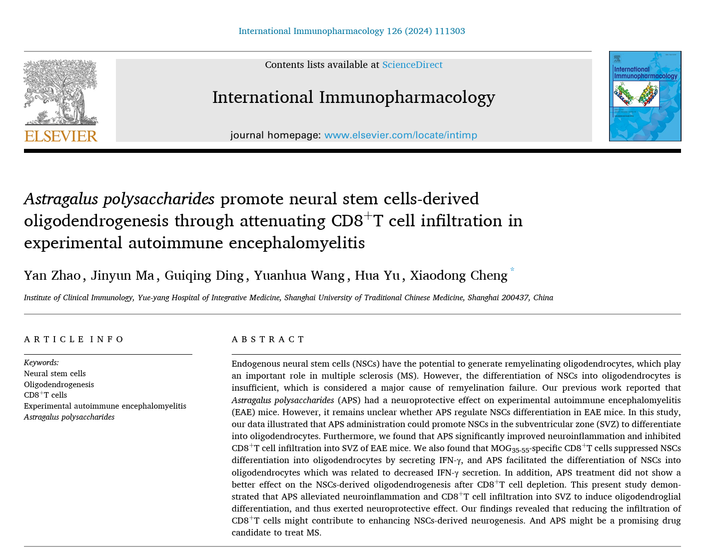 受传统中医理论的启发,科研人员聚焦“促进中枢神经髓鞘再生”这一瓶颈性难题,延续前期研究工作思路,从神经干细胞(Neural Stem Cells, NSCs)的分化调控入手,建立MS经典动物模型—实验性自身免疫性脑脊髓膜炎(Experimental Autoimmune Encephalomyelitis,EAE),开展体内体外基础实验研究。研究策略是以EAE小鼠为研究对象,探索中药黄芪主要活性成分APS调控神经干细胞定向分化、促进中枢神经系统髓鞘再生的效应及其潜在机制。该研究成果最近在线发表于本领域国际著名学术期刊《国际免疫药理学》(International Immunopharmacology)(JCR 1区、药理学1区),论文名为Astragalus polysaccharides promote neural stem cells-derived oligodendrogenesis through attenuating CD8+T cell infiltration in experimental autoimmune encephalomyelitis(https://doi.org/10.1016/j.intimp.2023.111303)。