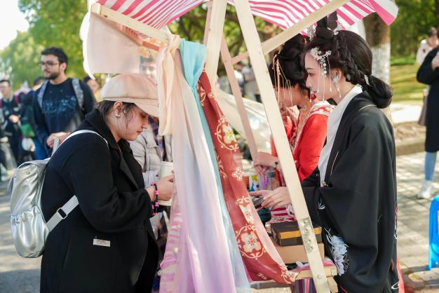原来,上海师范大学扎染社、华东政法大学仁礼射艺协会、上海理工大学尚理国学社、上海应用技术大学棣棠汉服社、上海健康医学院翰墨书画艺团、上海音乐学院音“服”团等大学生社团在杏花步道的两侧展示才艺,一起加入“文化赋能 大美中医”上海中医药大学传统文化艺术节系列活动。